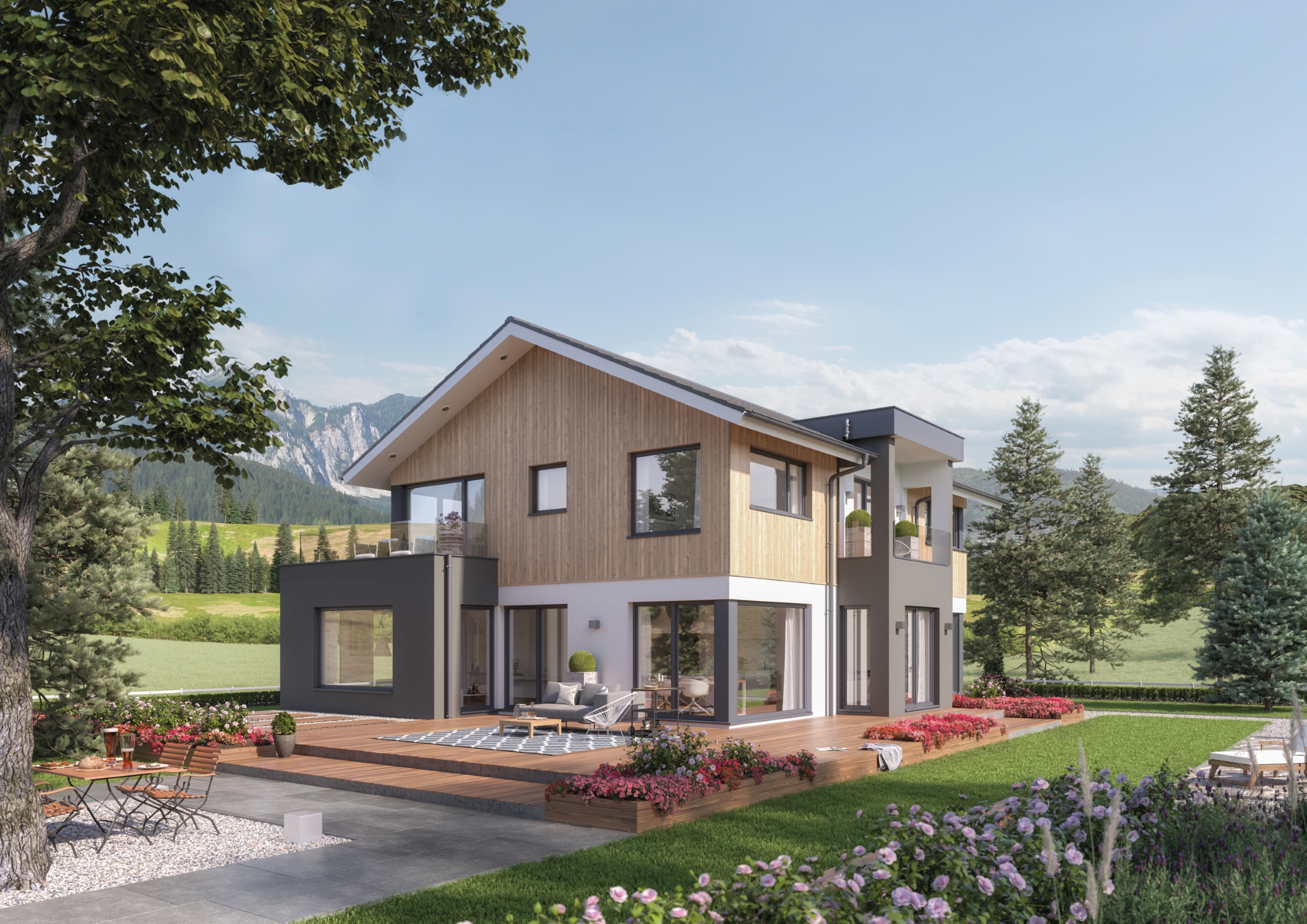 Unsere Klima-Hybrid Holz-Sandzementstein-Massivwand verkörpert die perfekte Verbindung der fortschrittlichen und energieeffizienten HolzFertigbauweise mit den Vorteilen des Baustoffs Stein. Die innovative HolzFertigbauweise mit Gipsfaserplatten als klima- und feuchtigkeitsregulierende Beplankung, einer nachhaltigen Mineraldämmung im Gefachbereich des Holzrahmenfachwerks sowie einer Mineralwoll-Dämmplatte als Außendämmung für Wärme- und Schalldämmung ist die Basiskonstruktion dieser besonderen Bauweise. Kombiniert wird sie vor Ort auf der Baustelle durch eine massive und verputzte Sandzementstein-Fassade, veredelt mit mineralischen Putz und einer Kratzputz-Struktur. Gebaut für höchste Ansprüche an Bau-Qualität, Wohn-Komfort und Nachhaltigkeit.*