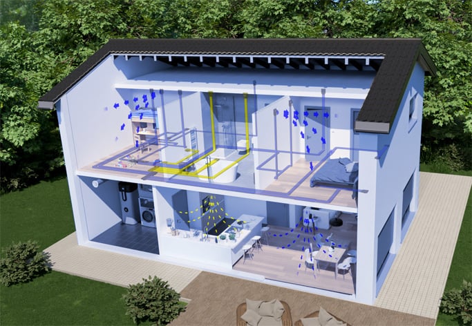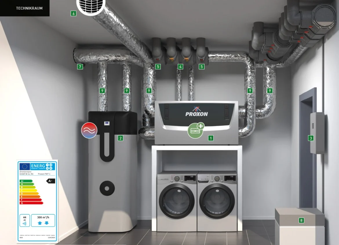 Das Zentralgerät und die Trinkwasser-Wärmepumpe werden im Haus-Technikraum (z. B. in EG oder KG) platziert. Zuluft-Blechkanäle führen die warme (während des Heizbetriebes) oder die gekühlte und entfeuchtete Luft (während des Kühlbetriebes) in die einzelnen Räume, in die sie über Zuluftventile Das 5 in 1 System – Heizen, Kühlen, Lüften, Luftreinigung und Warmwasser in einem System in Wand oder Decke zugfrei eingeblasen wird. In den Luftauslässen befinden sich elektrische Wärmeelemente, die die Wärmepumpe bei Bedarf unterstützen. Bei den Eco+ Systeme können die Schlafräume (max. drei) bei Bedarf automatisch temperaturreduziert werden.