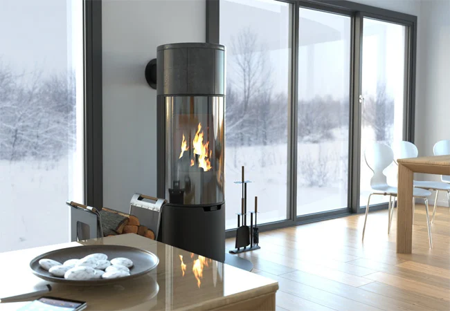 Über die Zuluft und die laufende Luft-LuftWärmepumpe wird im aktiven Ofenbetrieb indirekt die überschüssige Wärmeenergie eines Ofens auf andere Bereiche im Gebäude übertragen.